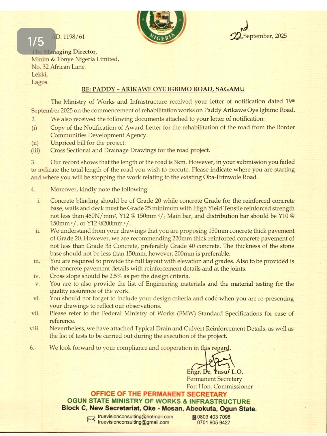According to an official letter from the Permanent Secretary of the Ministry of Works, Engr. Dr Yusuf I. O, dated September 22, 2025, the state government identified multiple critical issues: