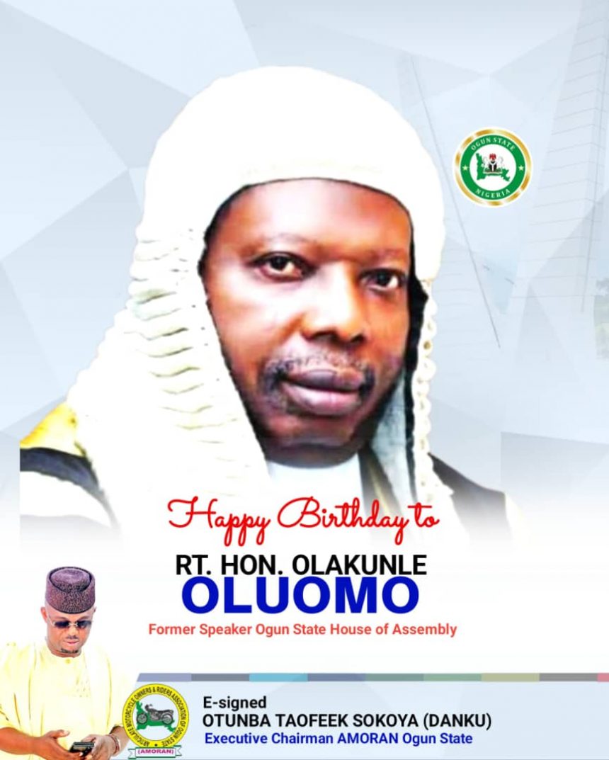 ABEOKUTA– The Articulate Motorcycle Owners and Riders Association of Nigeria (AMORAN), Ogun State Chapter, has extended warm felicitations to the former Speaker of the Ogun State House of Assembly, the Rt Hon. Olakunle Taiwo Oluomo, on the occasion of his 62nd birthday.